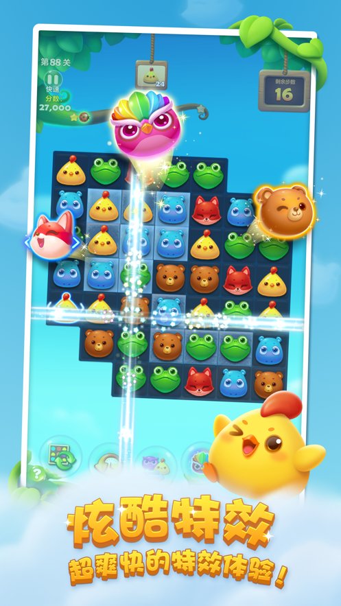 滑动手指让三个及以上的同色小动物横竖相连即可消除,完成每关的指定消除目标即可过关!